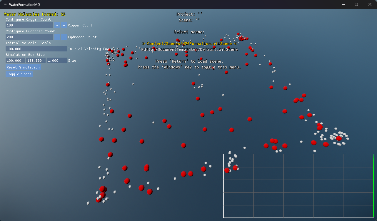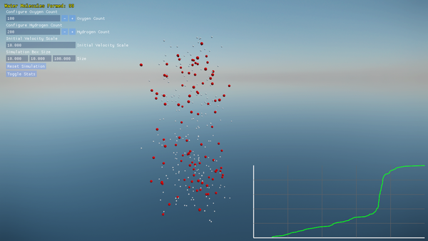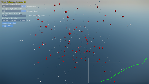 Water Molecular Dynamics Simulation is a physics-driven C++ application that recreates the emergence of water molecules from individual oxygen and hydrogen atoms. By computing bonded and non-bonded forces at each time step, the program delivers a scientifically grounded yet visually engaging demo of molecular behavior in an interactive 3D environment.